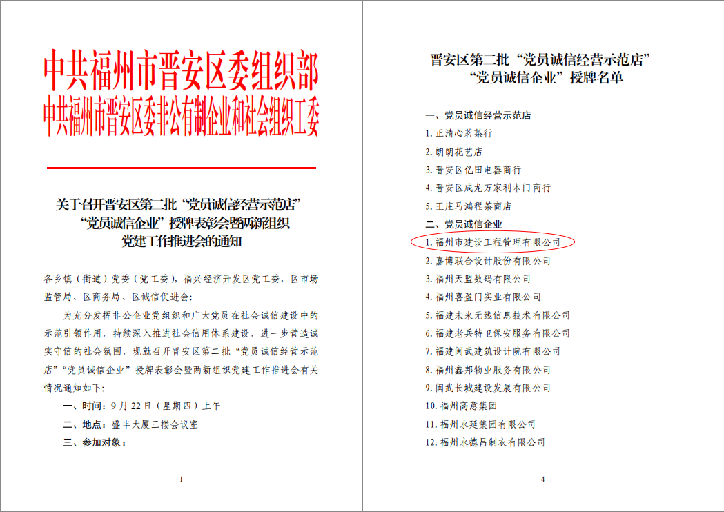 9月22日上午,晉安區(qū)委組織部等部門聯(lián)合舉辦晉安區(qū)第二批“黨員誠信示范店”“黨員誠信企業(yè)”授牌表彰會,我司榮獲“黨員誠信企業(yè)”榮譽(yù)稱號。這個稱號是對我司長期以來誠信經(jīng)營的肯定,也是對我們今后堅持誠信合法經(jīng)營的一種鞭策。
